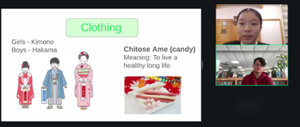 後半で、もうすぐ行われる七五三についての発表をしました。七五三の由来や意味、着物と袴、千歳飴、写真撮影、神社のお参りを簡単に説明しました。UNIS生からは鋭いなと思う質問がたくさんあり、日本の行事に興味を持ってもらえて嬉しかったです。着物の色はどんな意味があるのか、七五三とこどもの日の違い、女の子を祝う日はあるのか等々、他にもいい質問をしてくれました。私たちが普段意識することのないことに着眼していて、一瞬考えさせられることもありましたが、それも含めて面白かったです。