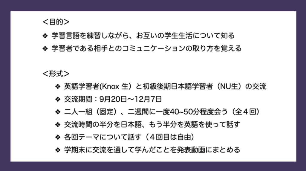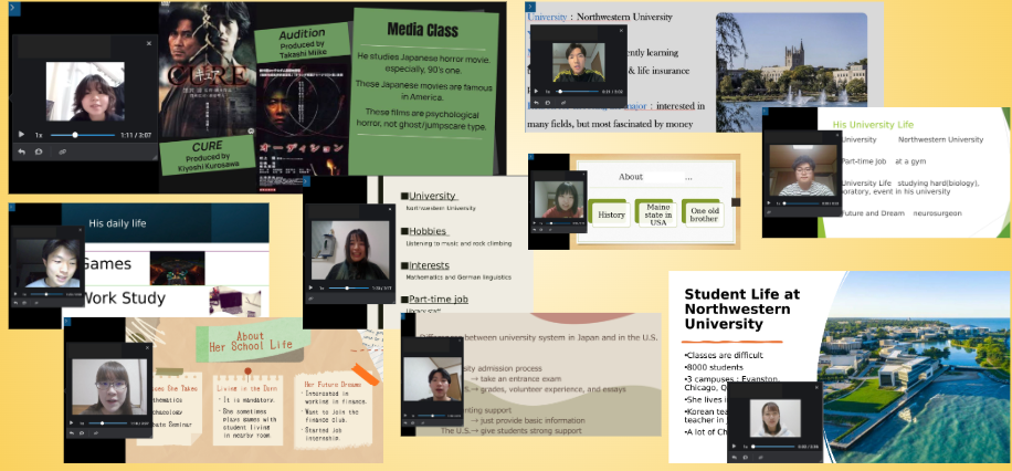 ノースウエスタン大学とのSession 2では、アメリカの大学生とペアを組んでの交流を行いました。学校生活を主なテーマに、ペアでの活動を中心に9月から12月まで三か月の交流を行ってきました。これまでの交流を時系列に沿って振り返っていきます。