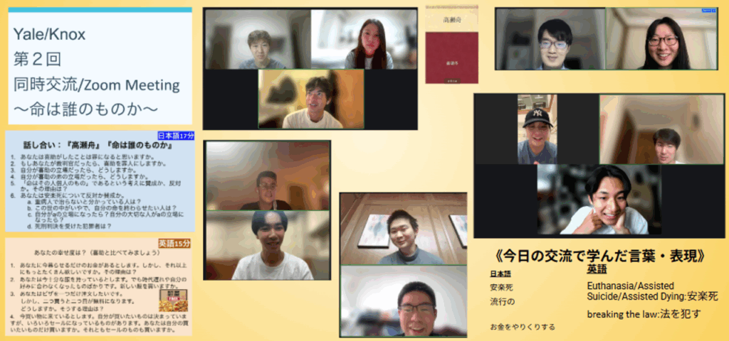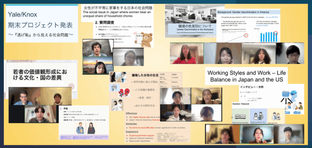 Session3では、Yale大学の4年生とKnox生で9月上旬〜12月上旬の約3カ月間交流を行いました。Zoomを通じた同時交流は全5回行われ、毎回3〜4人の少人数グループで活動を行いました。このSessionでは、それぞれの学習言語(日本語・英語)を使いながら、日常的な話題から、価値観の違い、さらには研究テーマに基づく本格的な議論まで幅広く取り組み、学習としても文化理解としても非常に深い経験となりました。ここでは、それぞれのSessionで印象に残った経験や、自分の中で生まれた変化についてまとめたいと思います。