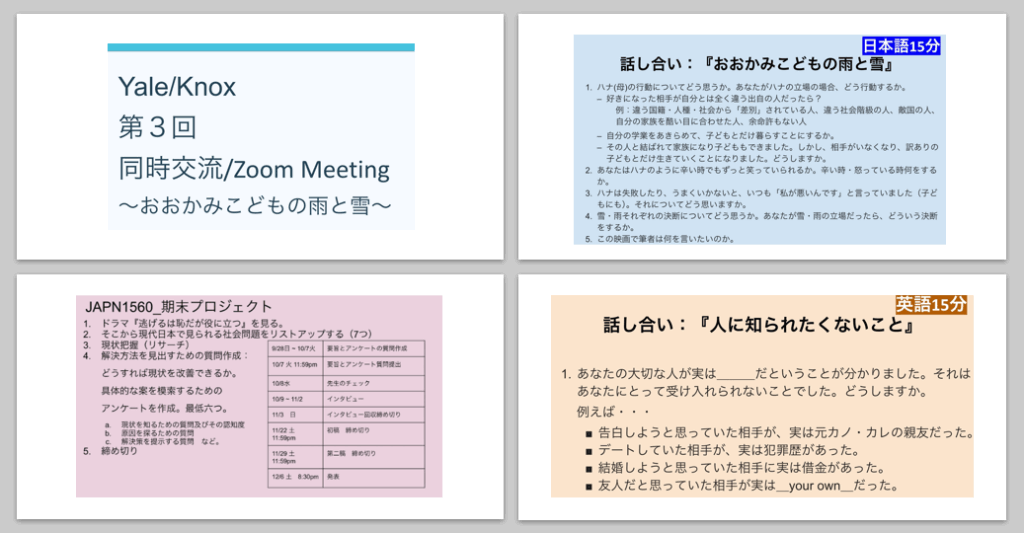 第3回は、映画『おおかみ子どもと雨と雪』を視聴した上で、ハナの行動や雨・雪の選択、作者が伝えたいことなどについて日本語で意見交換をしました。Yale生の作品の読み解きが非常に鋭く、母親の生き方や価値観の描かれ方など、日本の作品に対して多角的に分析していた点が印象的でした。