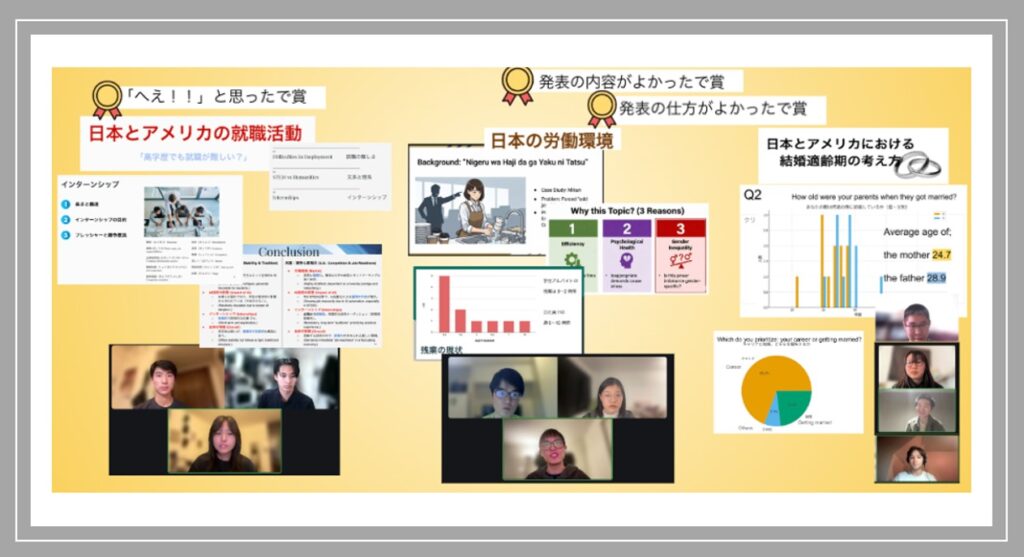後半の2回はファイナルプロジェクトの準備と発表に取り組みました。テーマは『逃げるは恥だが役に立つ』に関連する社会問題で、私たちのグループは「日米のワークライフバランスの違い」をテーマに設定しました。