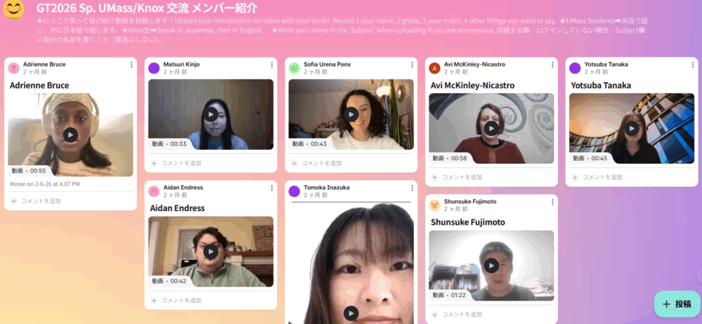 交流前に、Padletへ自己紹介の動画を投稿しました。自己紹介では、①名前②学年③専攻④その他伝えたいことを日本語→英語の順に話しました。